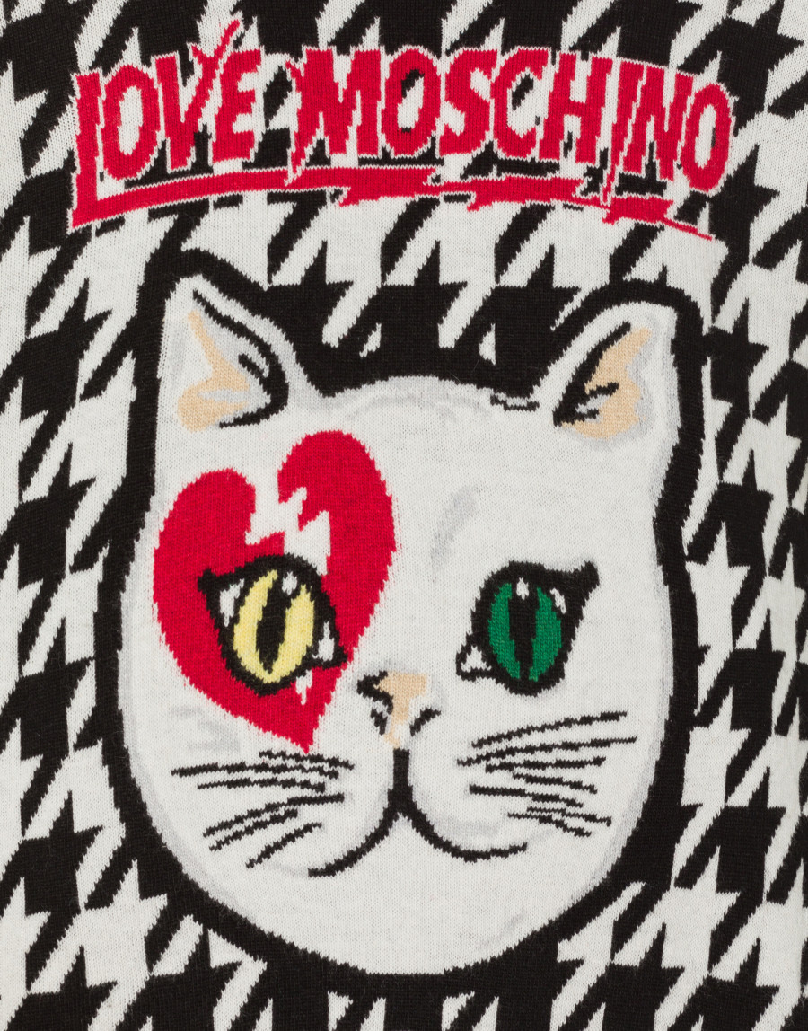 Fashionable women’s Bowie Cat jacquard sweater from Love Moschino featuring a jacquard effect, a houndstooth pattern, ribbed details, a round neck and long sleeves.