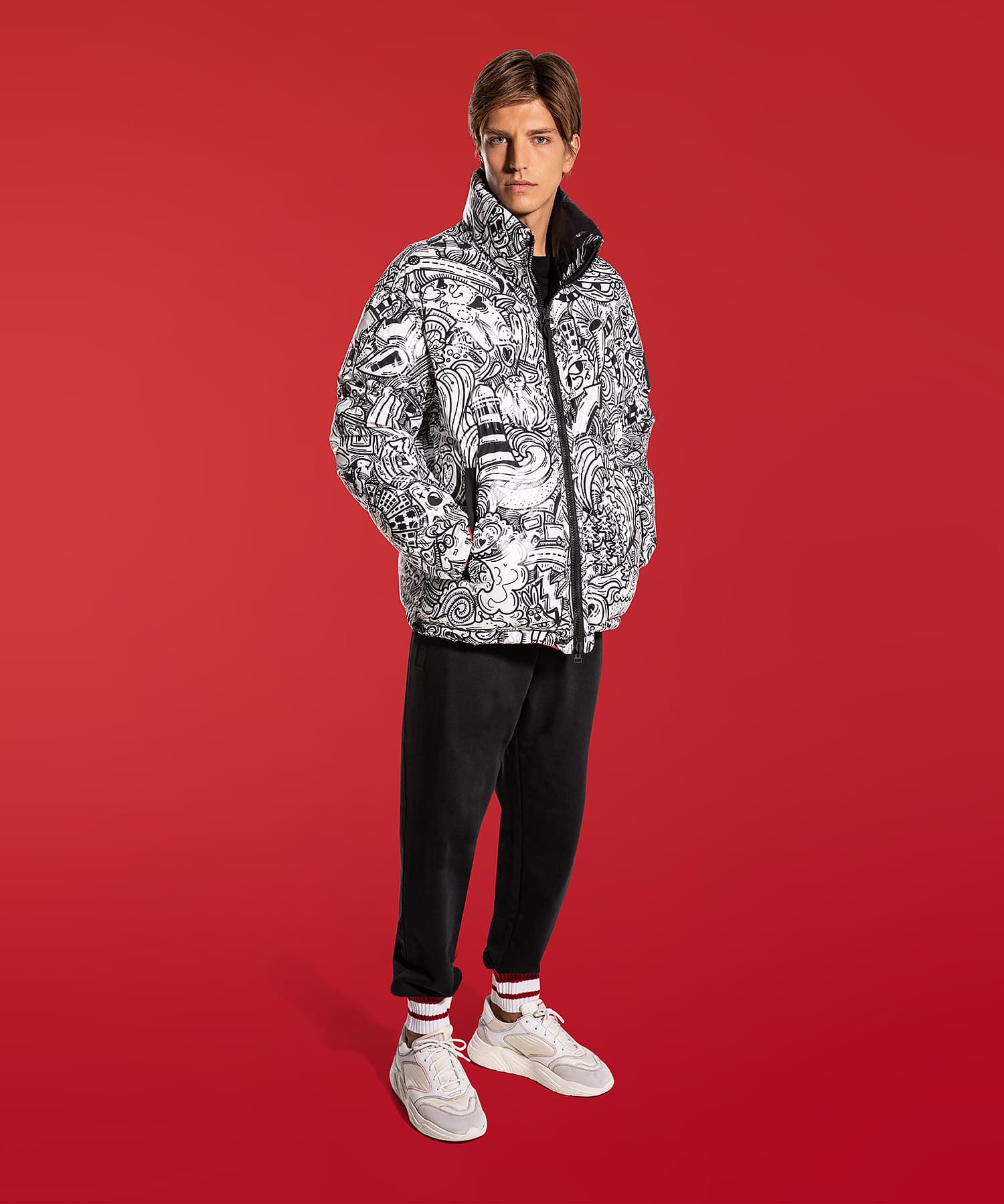 with an oversize fit, in particularly shiny nylon, made soft thanks