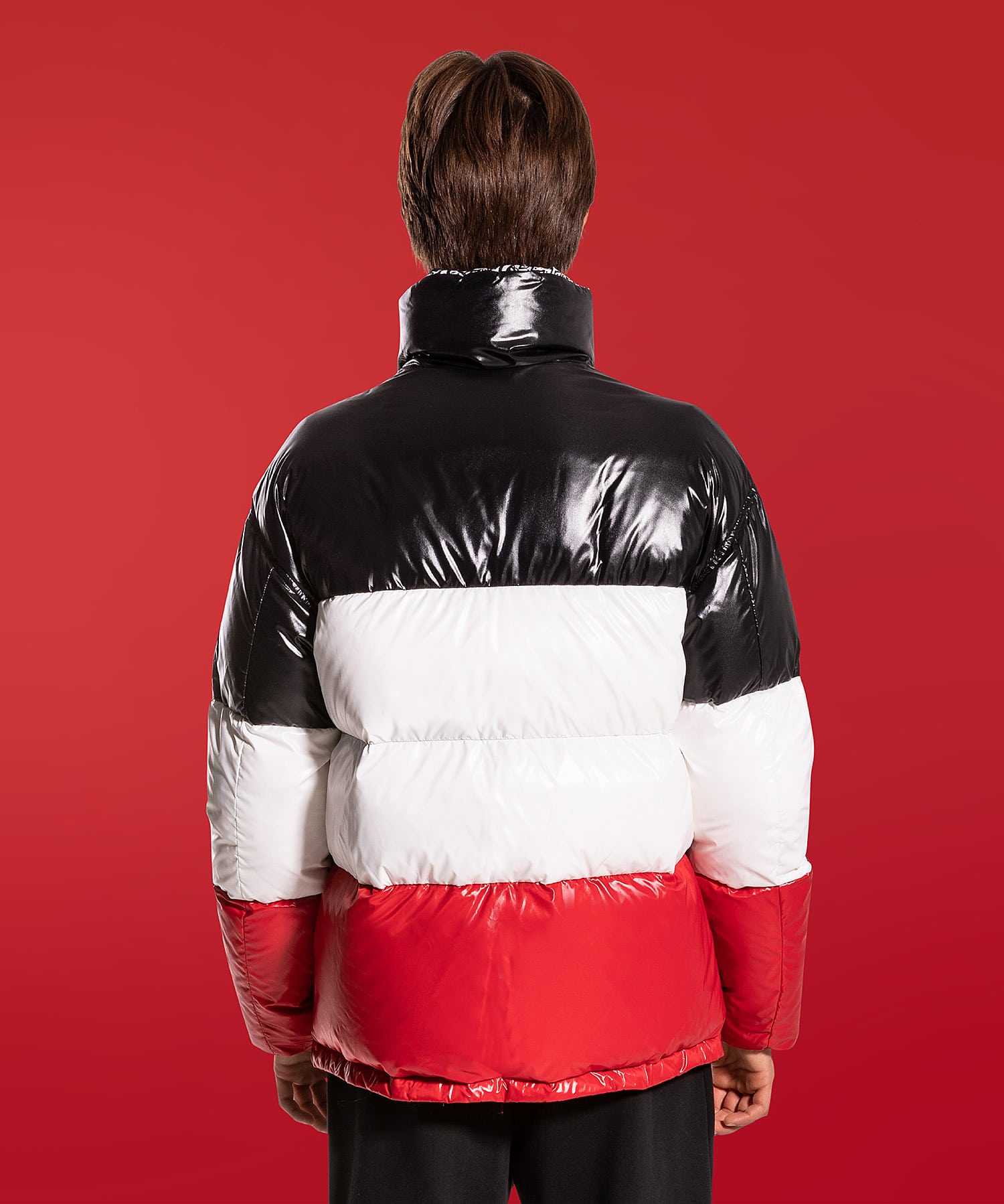 and stand up collar. One side in three block colors and the other one with